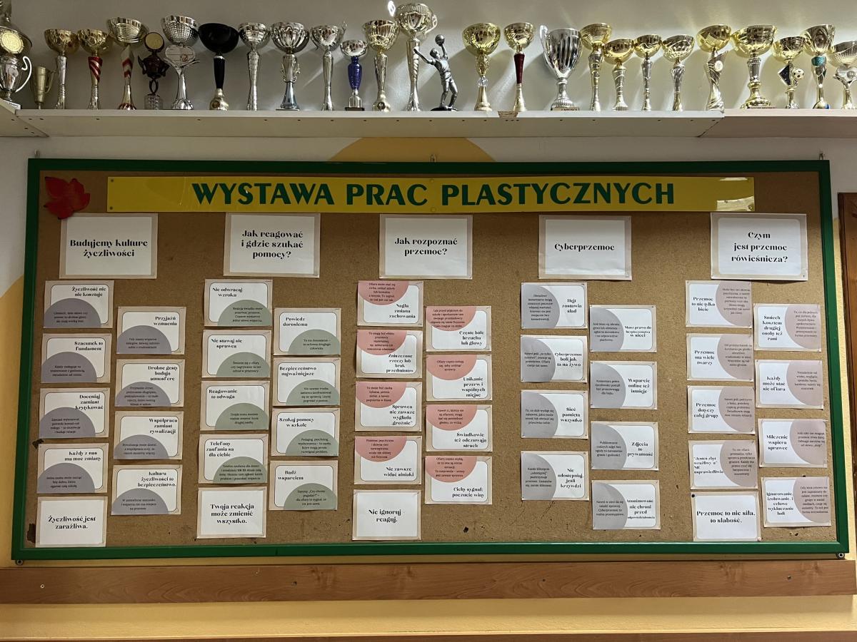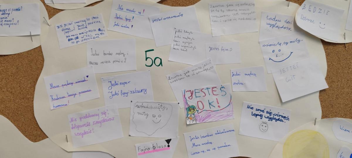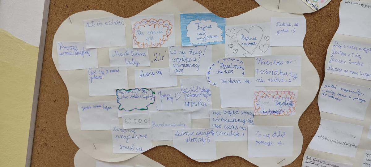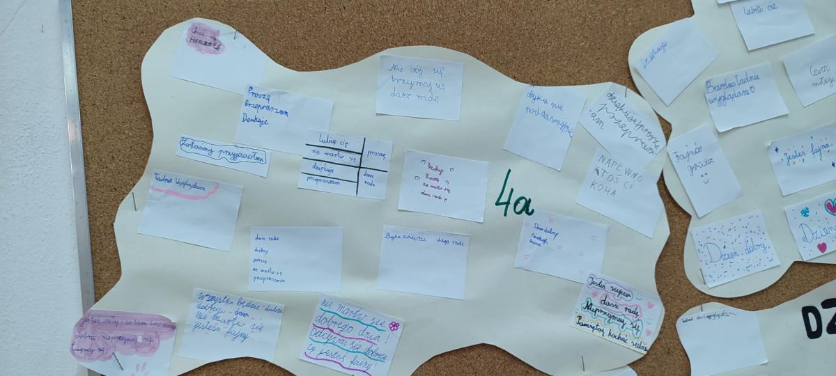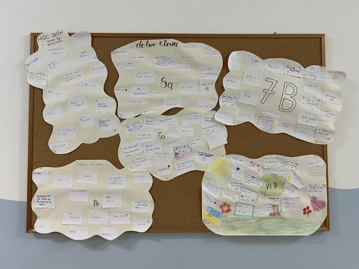 Wychowawcy przeprowadzili rozmowy podsumowujące – uczniowie dzielili się refleksjami, tym co ich poruszyło i co zapadło im w pamięć z minionego tygodnia. Powstały także gazetki klasowe na temat przeciwdziałania przemocy i budowania relacji.