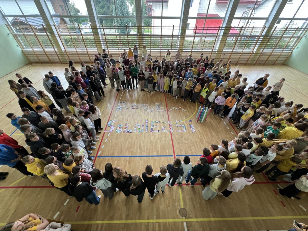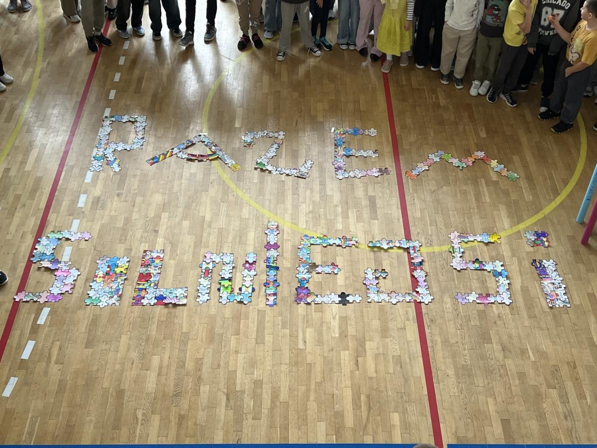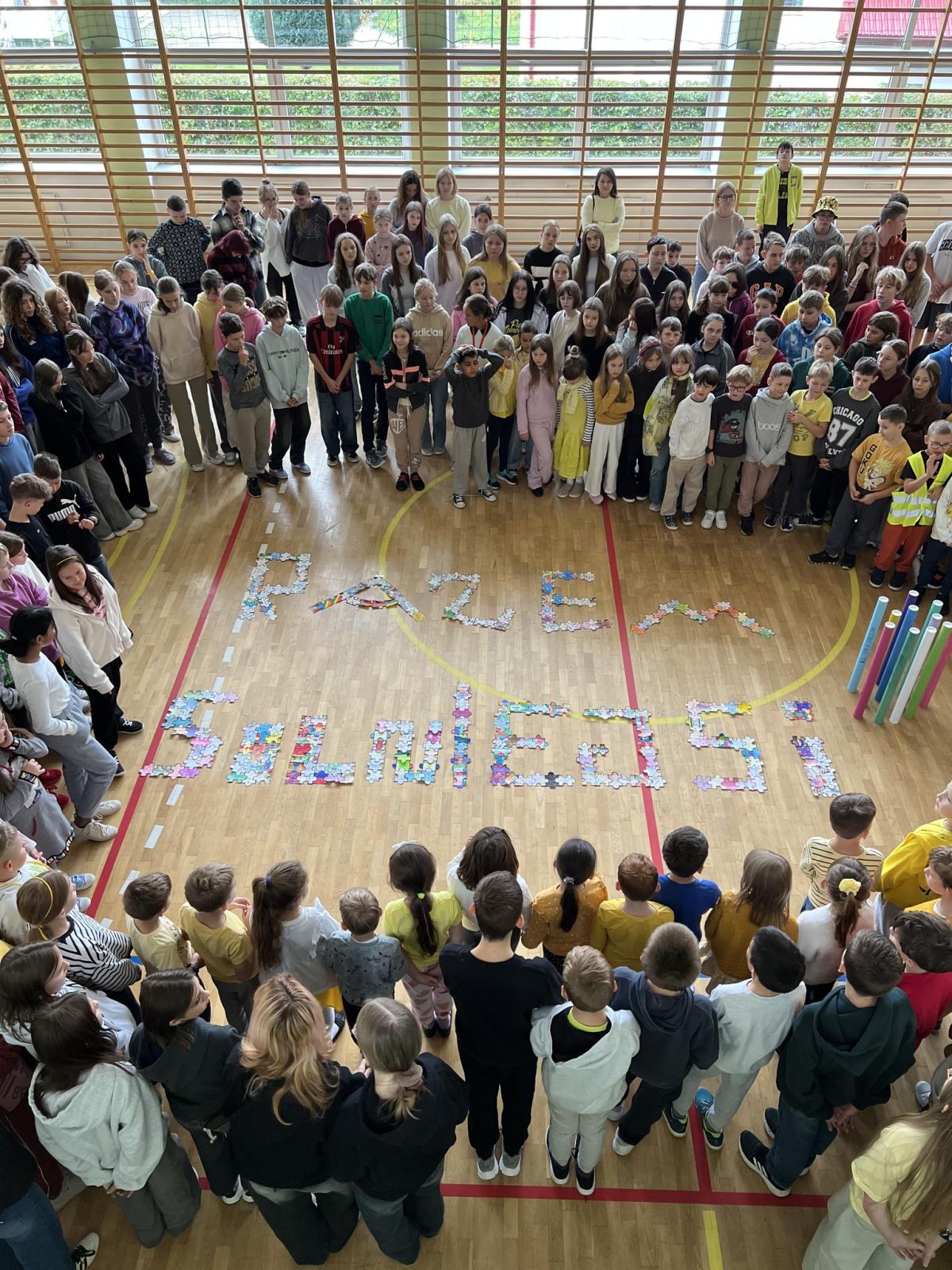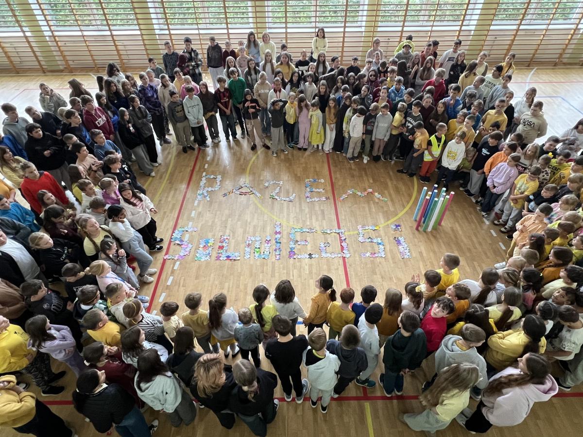 Na trzeciej lekcji odbyło się podsumowanie tygodnia na sali gimnastycznej – wspólne zdjęcie oraz prezentacja hasła utworzonego z puzzlowych liter. Hasło „RAZEM SILNIEJSI” zawisło na ścianie na I piętrze, by codziennie przypominać nam o mocy życzliwości i współpracy.