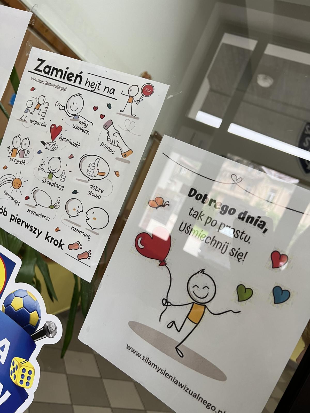 Tydzień ten był również wzbogacony o działania realizowane na języku polskim i plastyce. Na lekcjach języka polskiego uczniowie analizowali teksty literackie dotyczące przyjaźni i pomocy koleżeńskiej. Na lekcjach plastyki zaś tworzyli plakaty pod hasłem „Stop przemocy – wybieram życzliwość”, które zostaną zaprezentowane w Galerii plakatu na szkolnej stronie internetowej. Pedagodzy przygotowali gazetkę tematyczną dotyczącą przemocy rówieśniczej oraz budowania pozytywnych relacji i każdego dnia dodawali kolejny jej fragment dotyczący tematów przewodnich danego dnia.