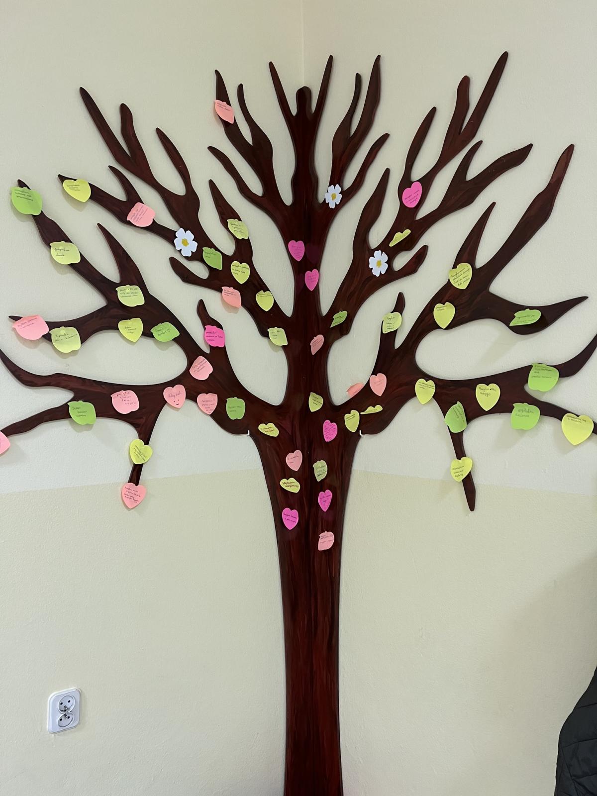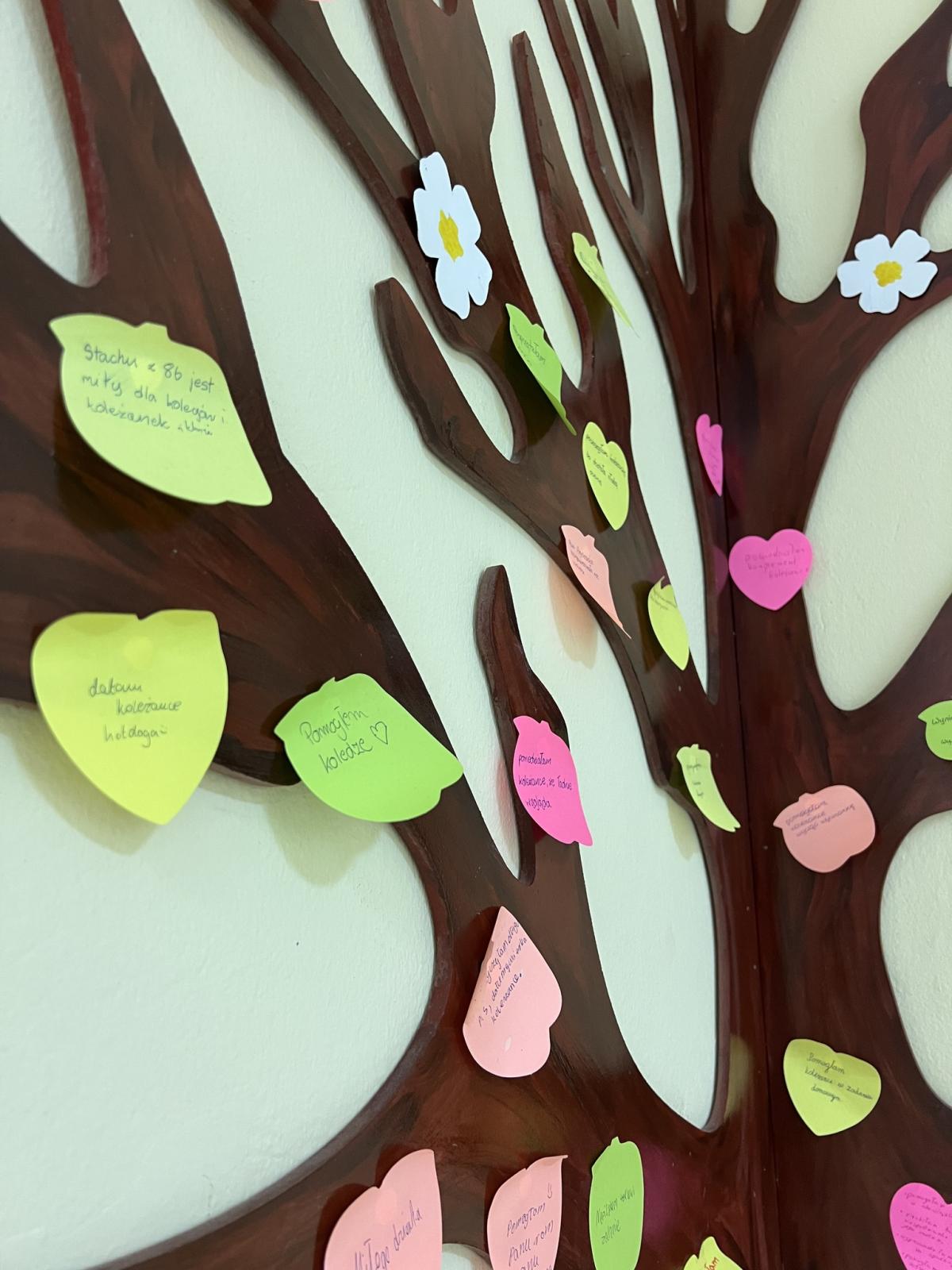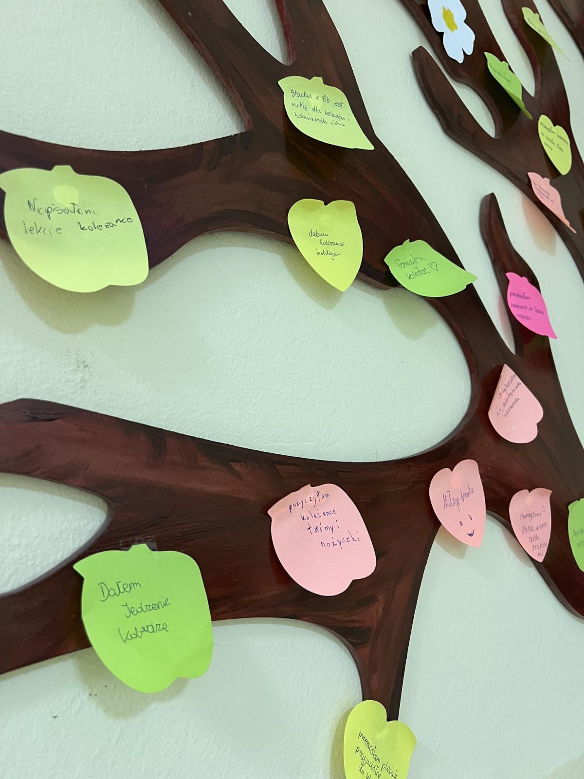 Rozmawialiśmy o tym, jak i kiedy warto pomagać innym. Uczniowie zostali zachęceni do wykonania dobrego uczynku, szczególnie wobec osób, których wcześniej unikali. W świetlicy powstało „drzewo pomocy”, na którym zawisły karteczki z opisami dobrych uczynków. Przy zawieszaniu karteczek pomocni byli wolontariusze.