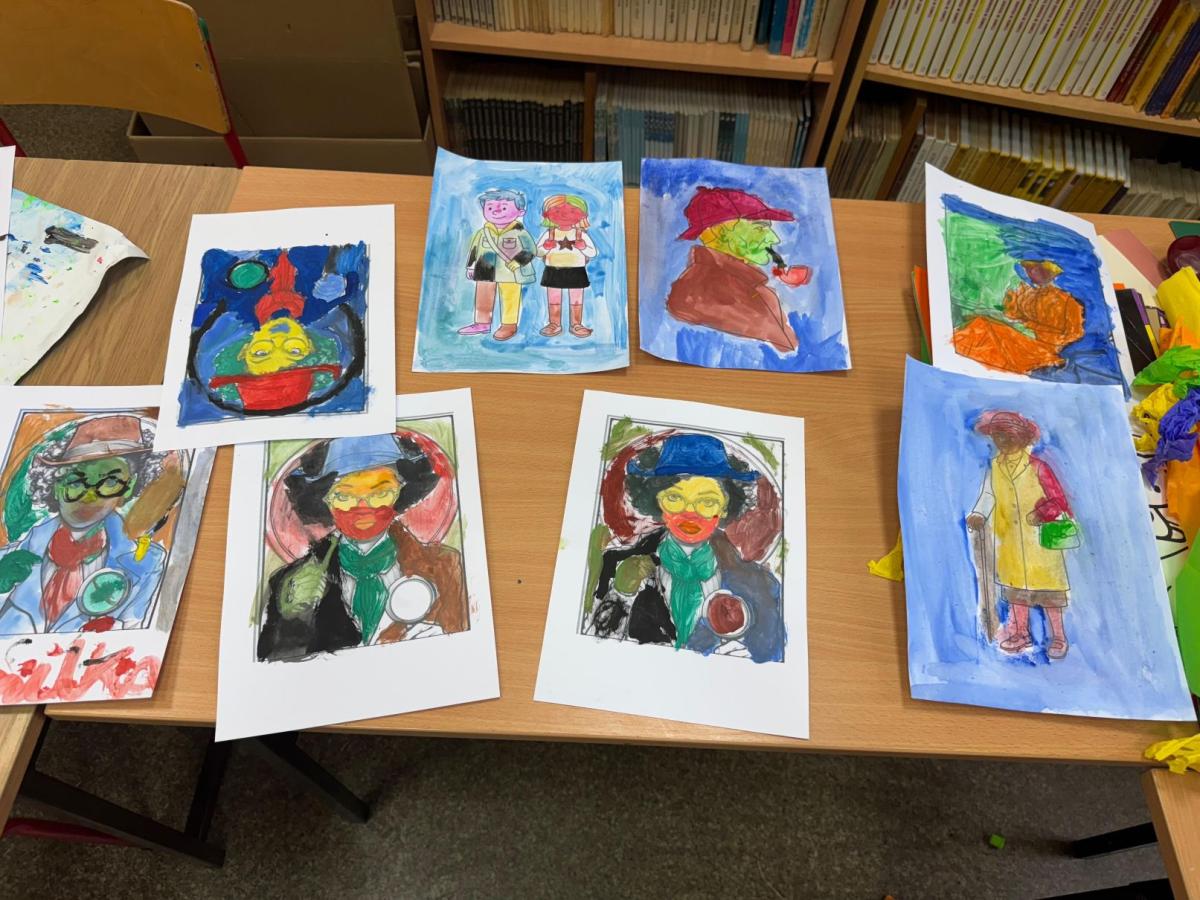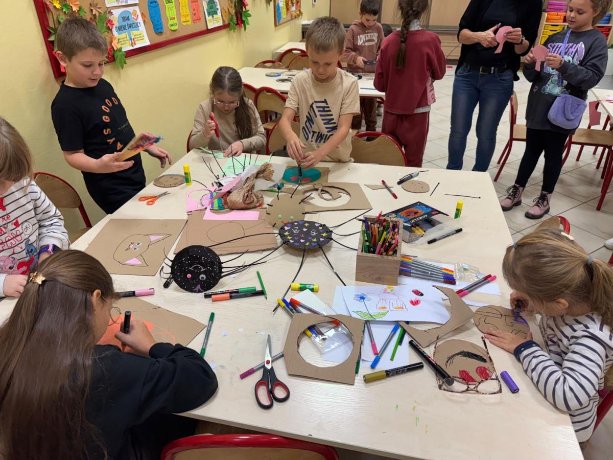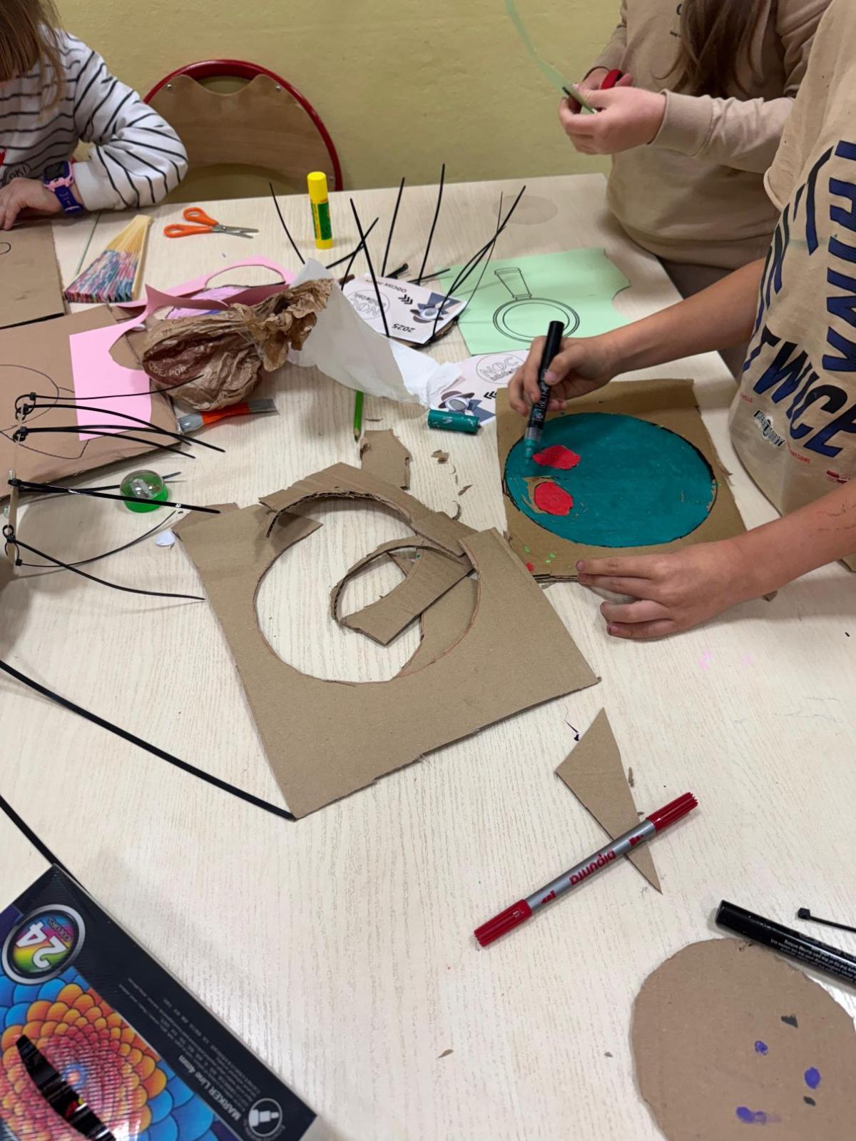 -warsztaty plastyczne „Detektywi w popart” oraz techniczne: lupy detektywa oraz pajączki z tektury;