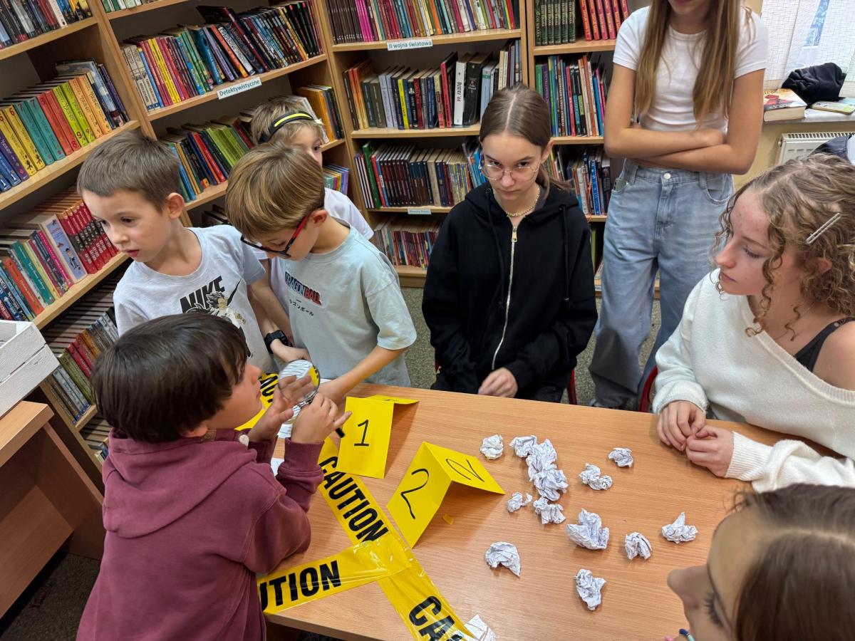 Biblioteka szkolna wraz z Miejską Biblioteką Publiczną oraz Szkolnym Kołem Wolontariatu przygotowała moc atrakcji dla uczniów z klas 1-8, a hasłem przewodnim całej akcji było „Do dzieła: detektywi w akcji”.