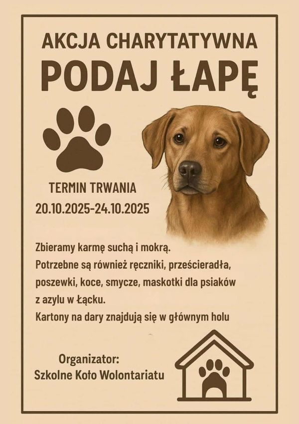 Szkolne Koło Wolontariatu Jedynki zachęca wszystkich do wzięcia udziału w zbiórce charytatywnej na rzecz psiaków z azylu w Łącku. Szczegóły na plakacie.