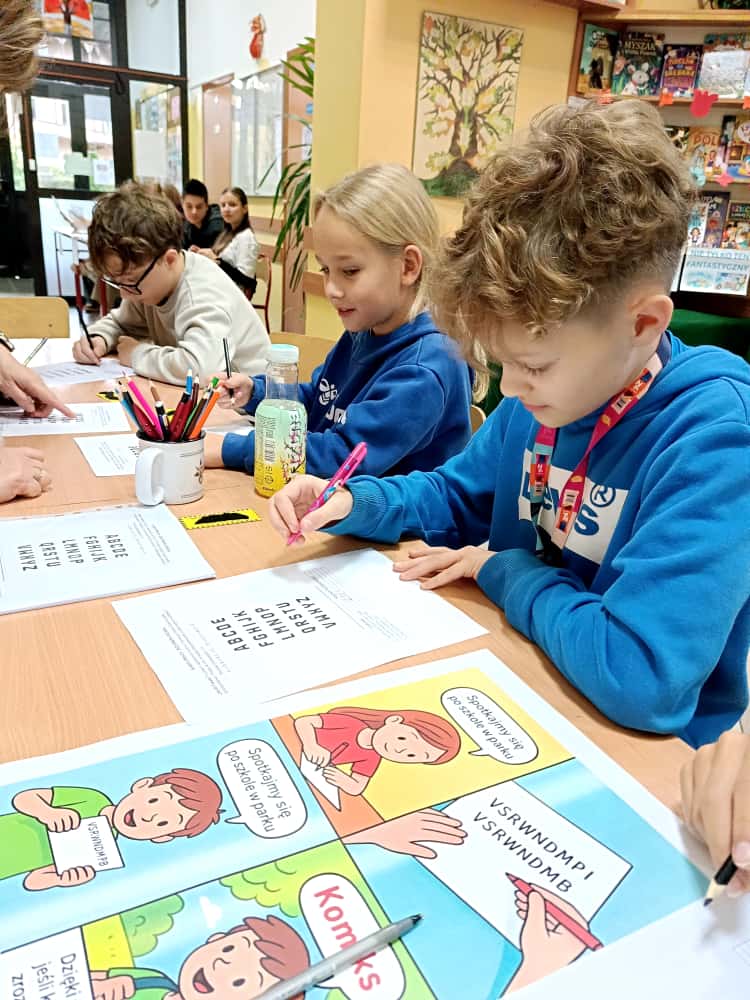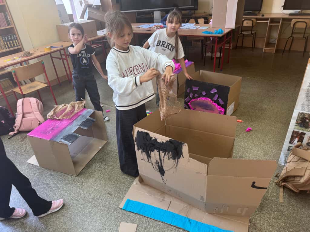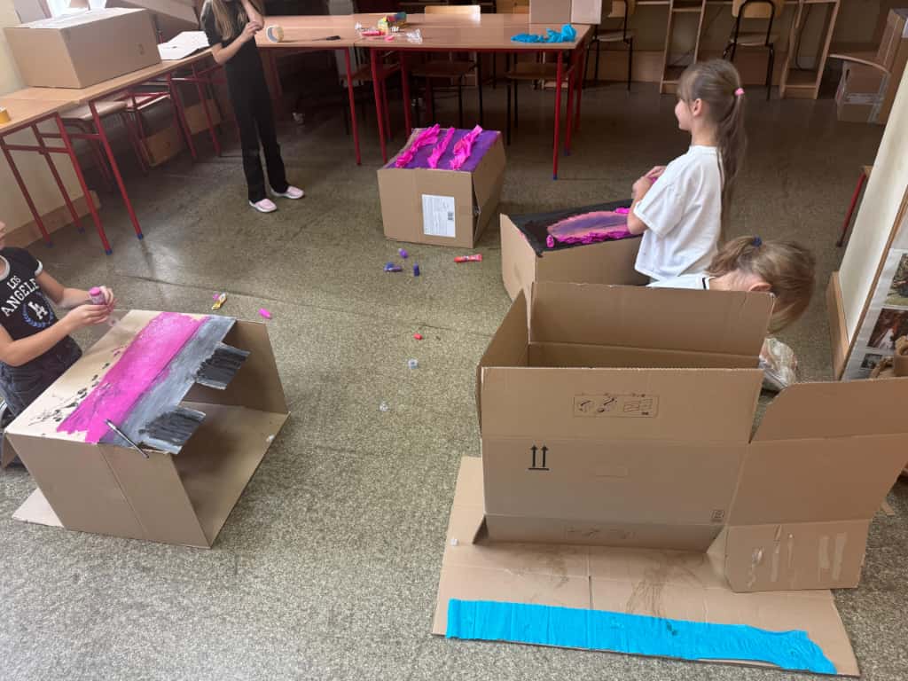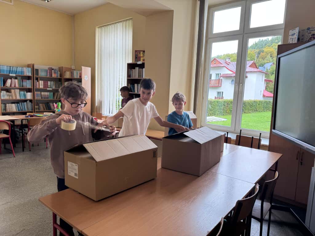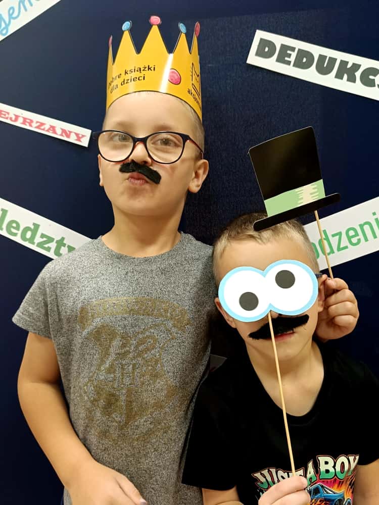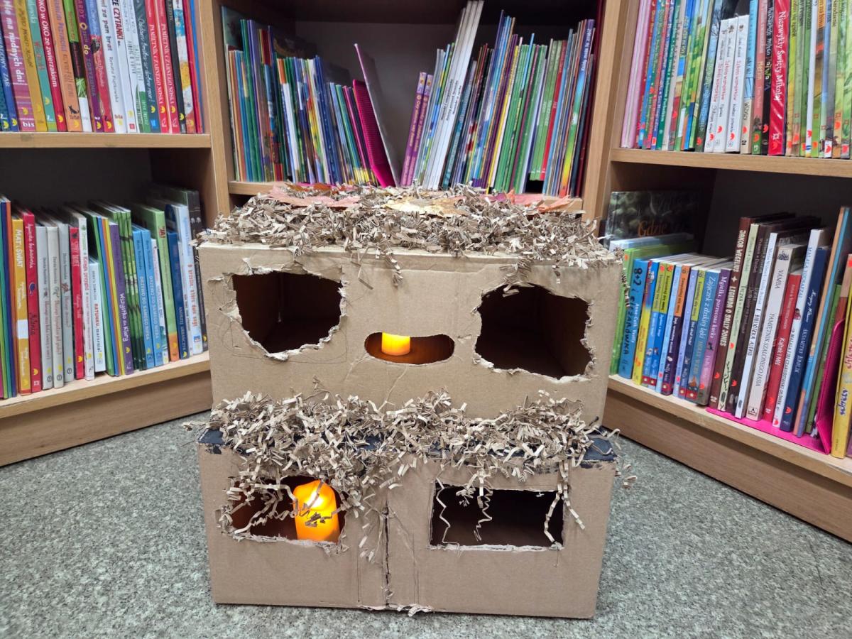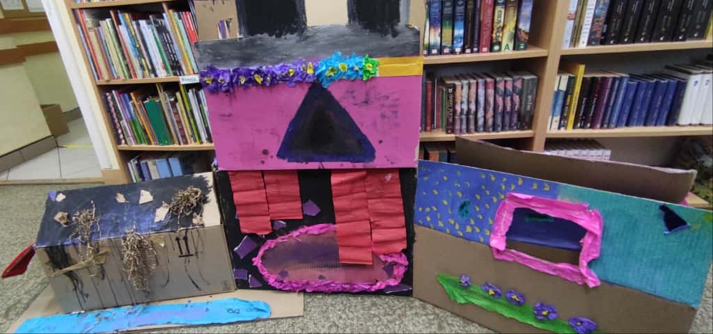 W bibliotece odbyły się kreatywne warsztaty, podczas których uczniowie budowali imponujące domy z kartonów- miejsca, w których mogłaby rozegrać się akcja przygód młodych detektywów. Było to połączenie literackiej inspiracji z techniczną pomysłowością – prawdziwa uczta dla wyobraźni!