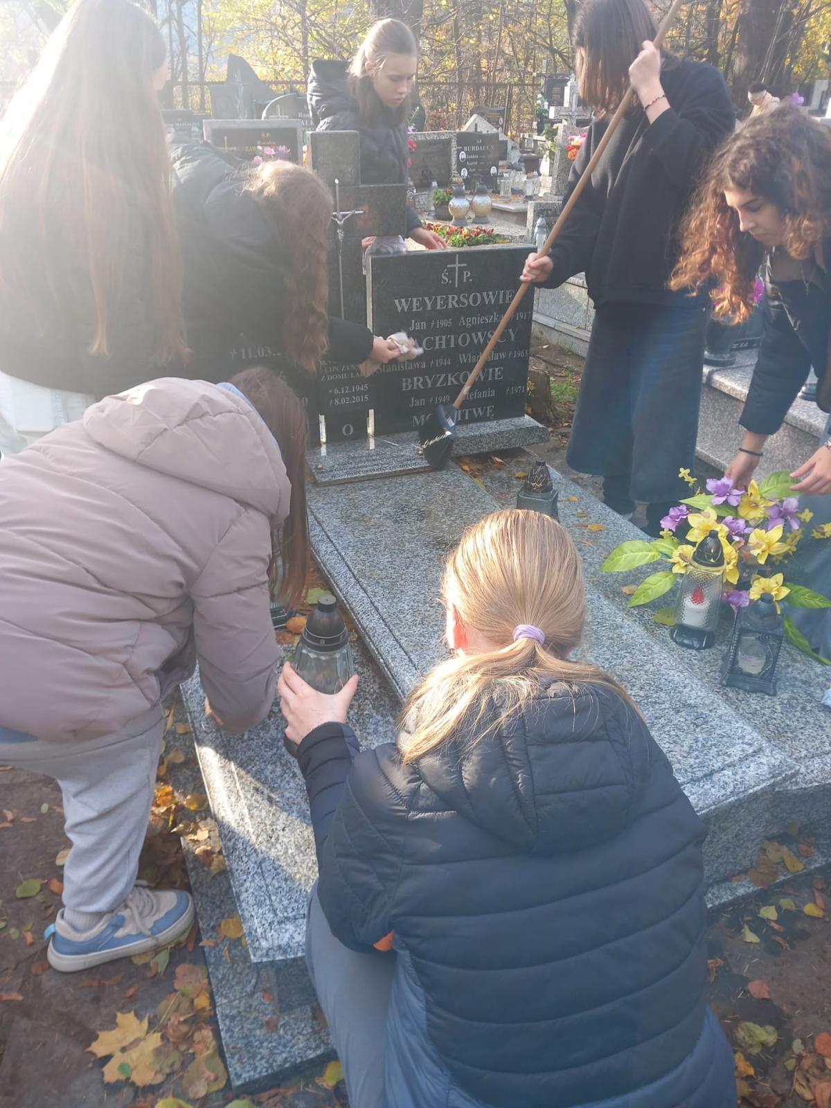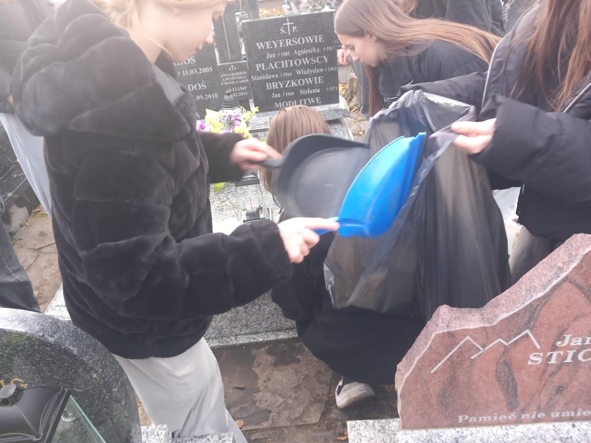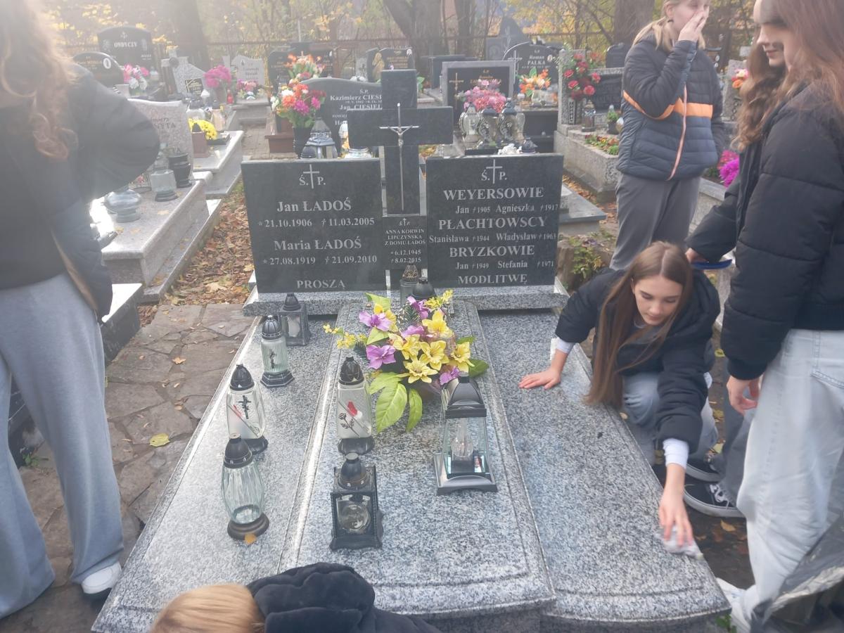 Z okazji Wszystkich Świętych uczniowie i nauczyciele naszej szkoły wzięli udział w akcji sprzątania grobów zmarłych nauczycieli oraz osób związanych z historią i działalnością szkoły. Zadbano też o miejsca pamięci narodowej, takie jak mogiły i pamiątkowe tablice.
