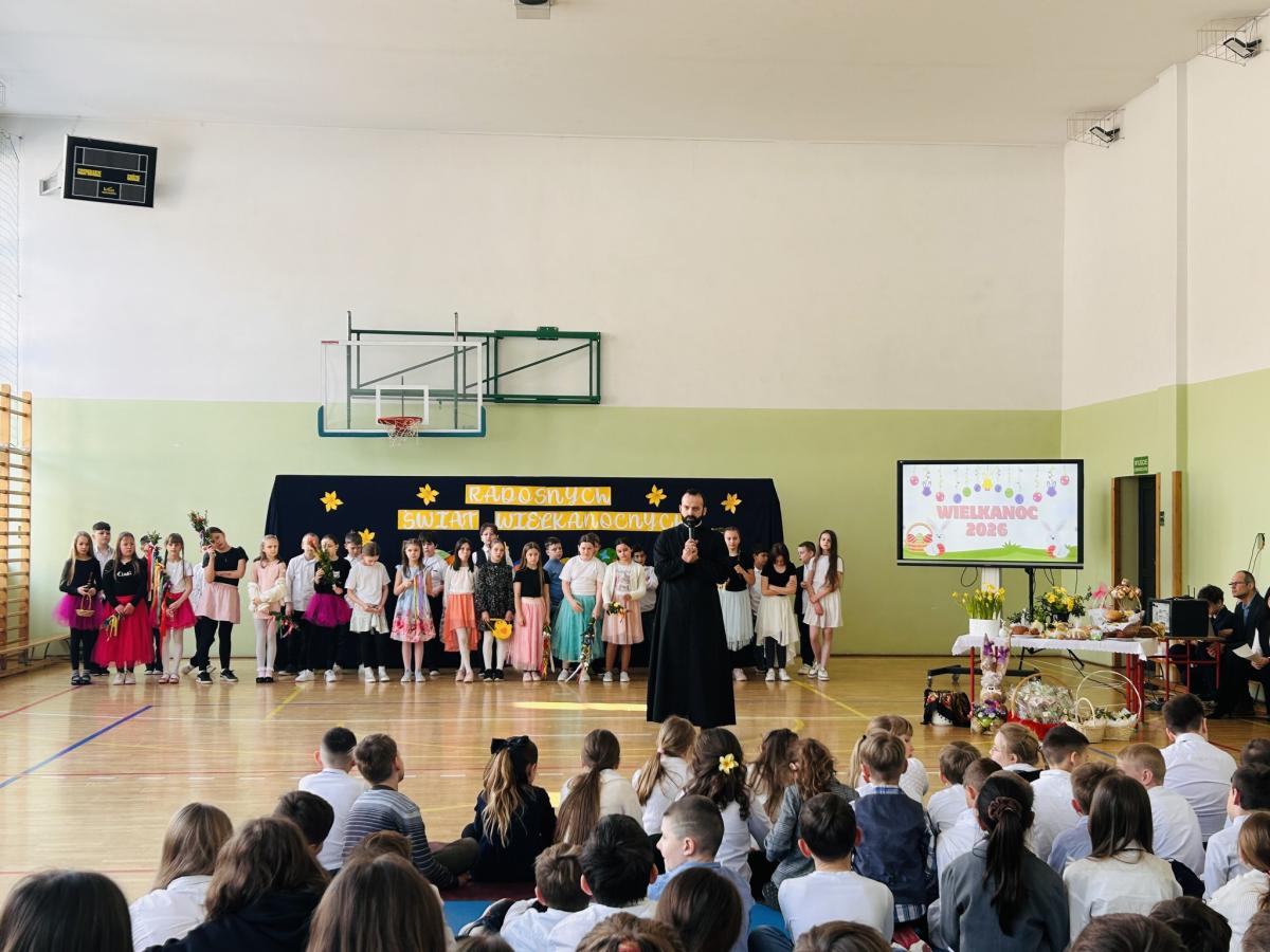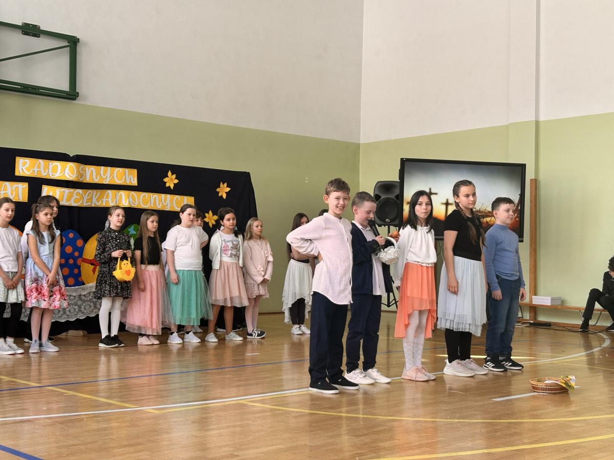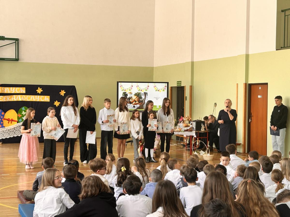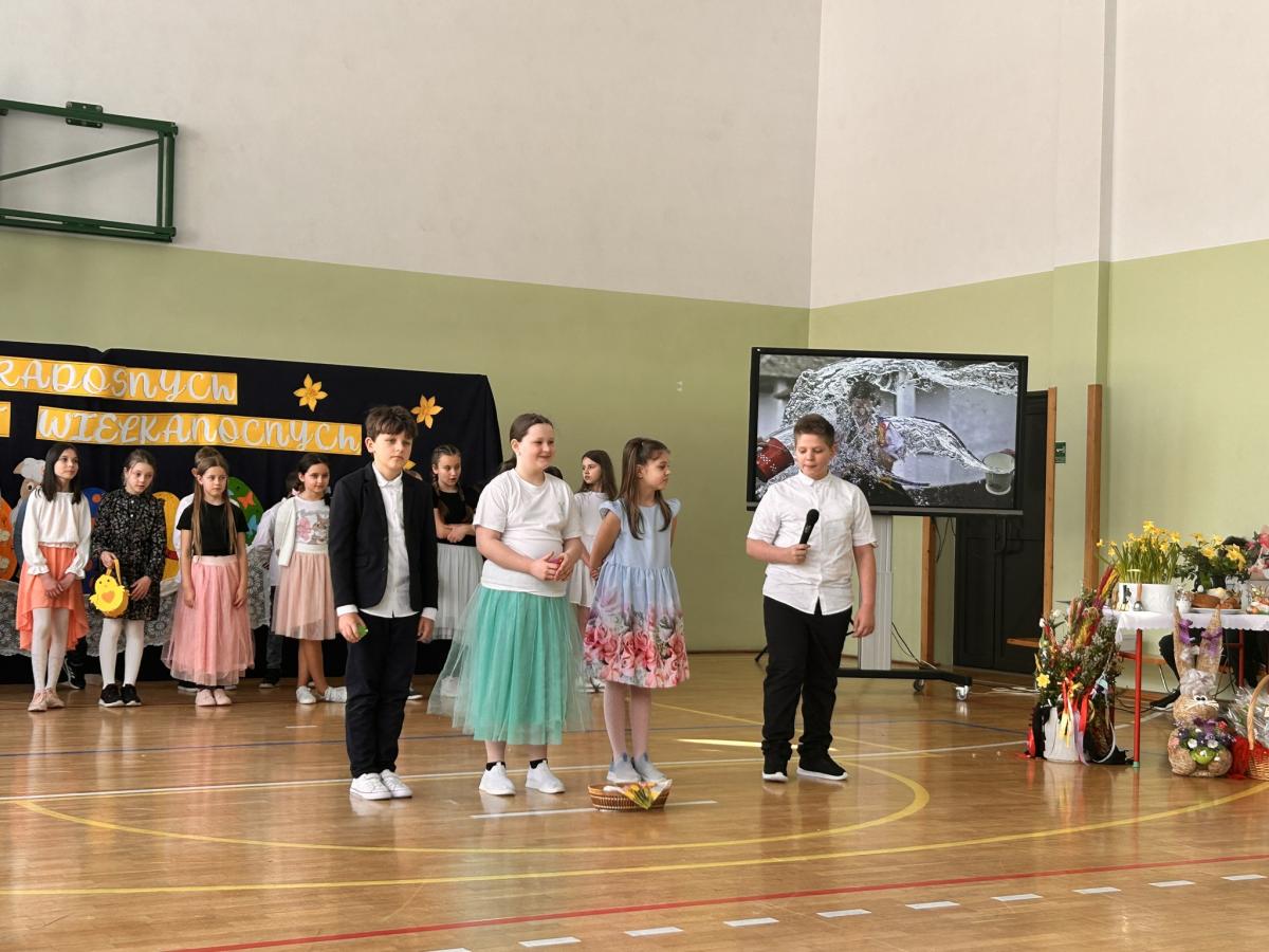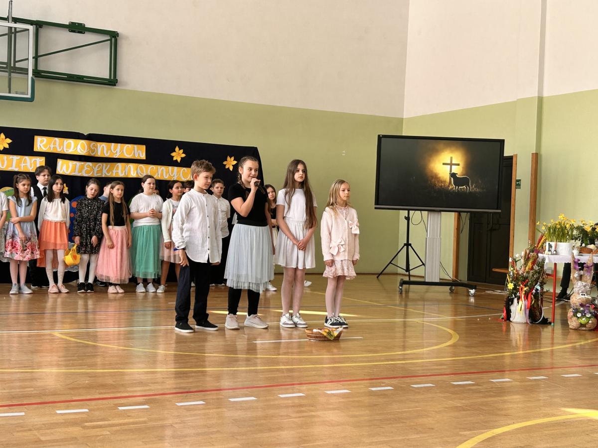 W ostatnim dniu nauki przed Świętami Wielkanocnymi na uroczyste spotkanie zaprosili nas uczniowie klas 3a i 3b. Trzecioklasiści w ciekawy i radosny sposób przybliżyli nam wielkanocne zwyczaje i tradycje, a także zaprezentowali piękne, świąteczne piosenki oraz taniec. Nie zabrakło serdecznych życzeń, które złożyli wszystkim obecnym i ich rodzinom wykonawcy a także pan dyrektor, ksiądz Kamil Porębski i Samorząd Uczniowski. WESOŁYCH ŚWIĄT.
